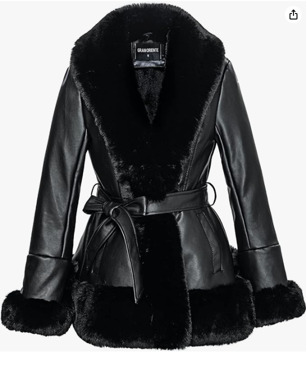 GRAN ORIENTE Women’s Faux Leather Jacket with Faux Fur Collar Long Sleeve Parka with Pockets Warm Winter Coat with Belt