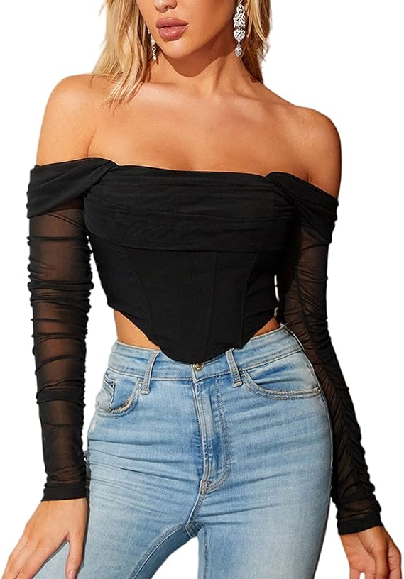 Mesh Sheer Long Sleeve Corset Crop top Ruched off Shoulder Blouse Push Up Party Boned Bustier for Cute Women Trendy